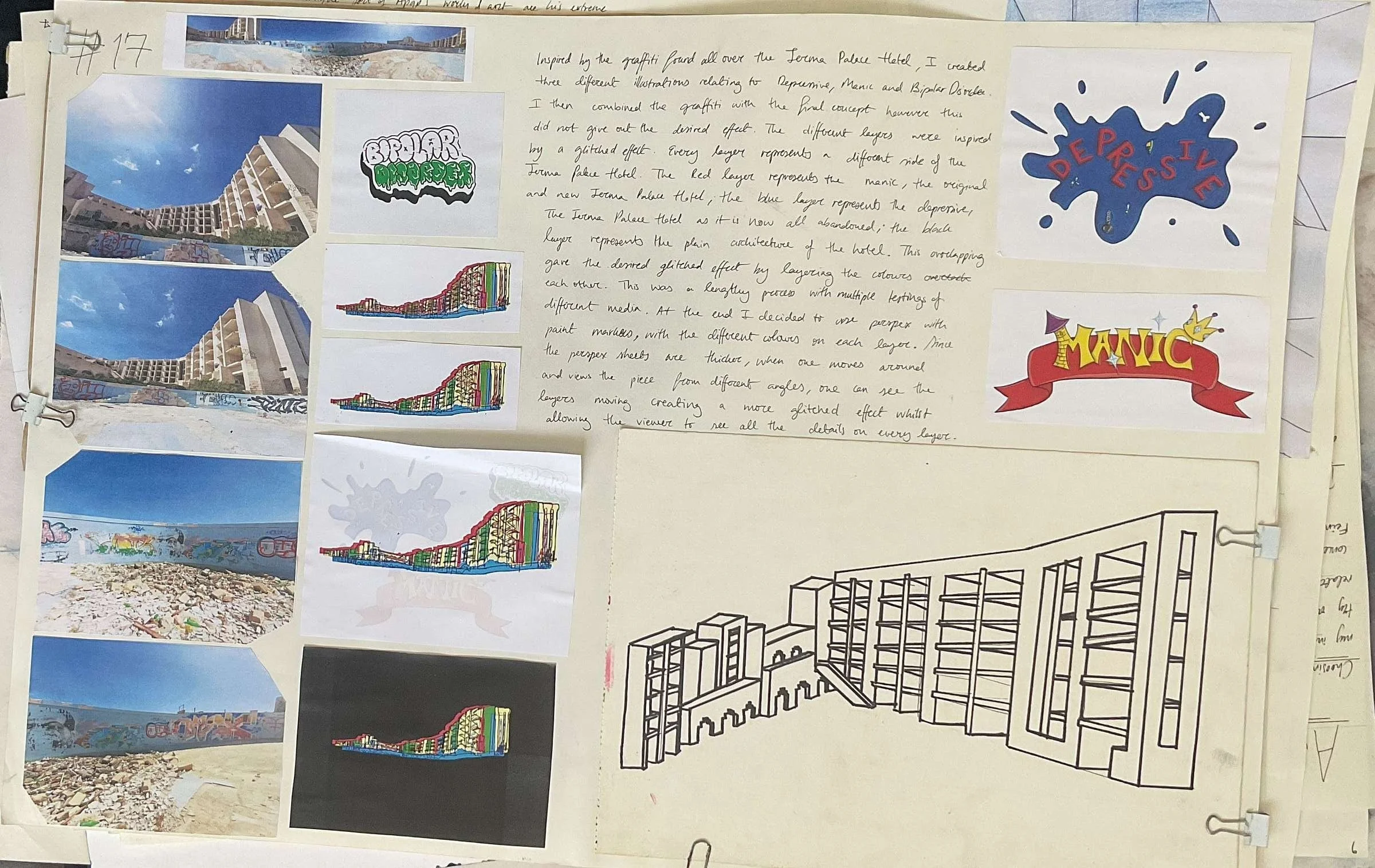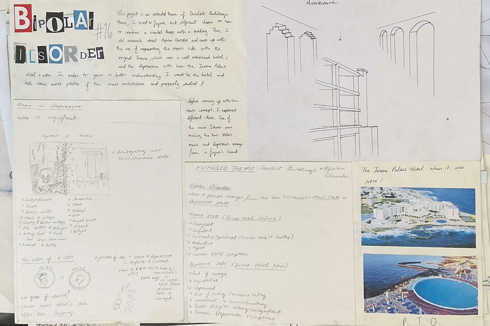 Bipolar Disorder explores the link between the abandoned Jerma Palace Hotel, and bipolar disorder. Where the manic state represents the hotel when it was new and luxurious, and the depressive state reflects the hotel as it is now, abandoned and overgrown.